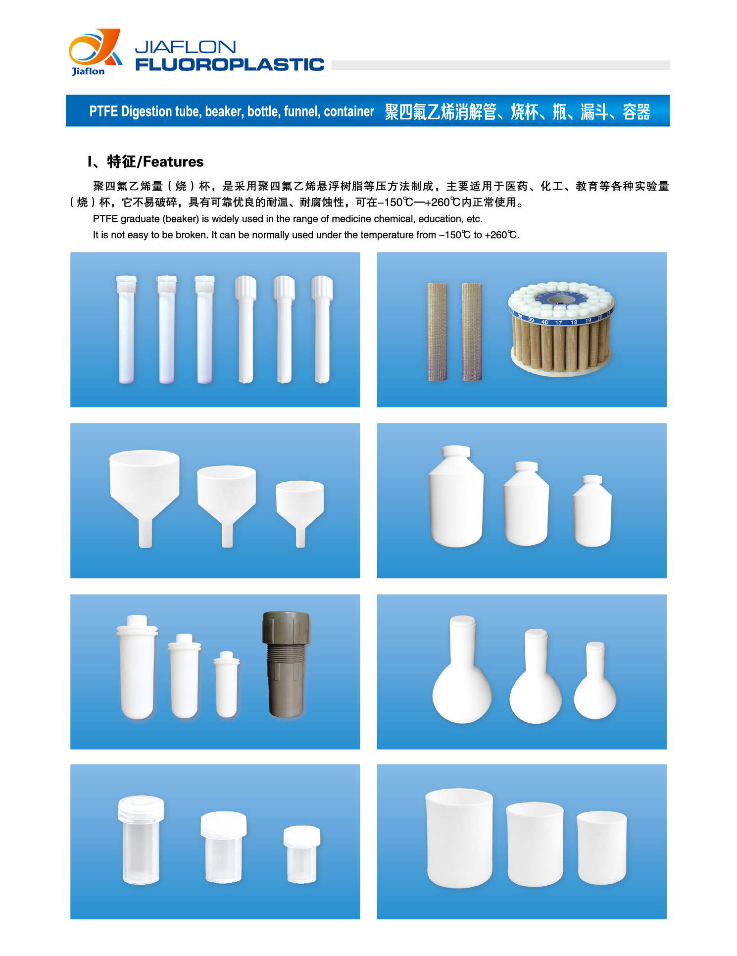 嘉翔氟塑 PTFE 实验室用品,以高纯聚四氟乙烯(PTFE)悬浮树脂为原料,经模压、烧结、精密车削 / 定型制成。作为医药、化工、教育、环保等实验领域的核心耗材,它**解决了传统玻璃、塑料器皿易破碎、不耐腐蚀、易溶出、易吸附的痛点,可在 - 150℃~+260℃超宽温域范围内长期稳定使用,是高端实验室分析、样品前处理的理想容器。