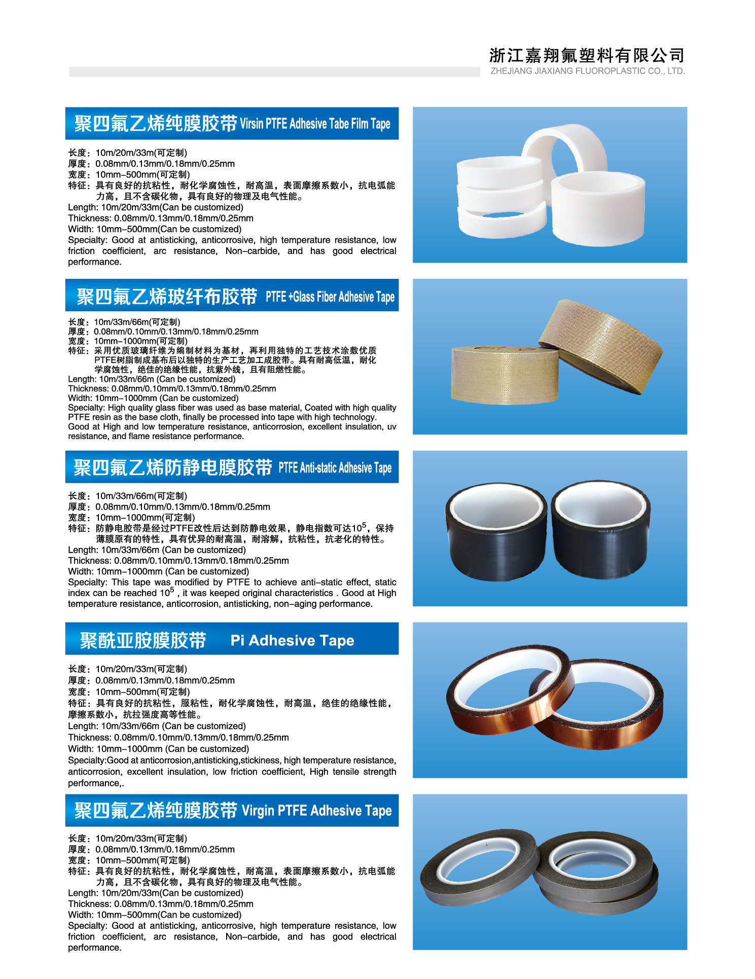 嘉翔氟塑 PTFE 胶带系列,以高纯聚四氟乙烯(PTFE) 为基材,经模压、车削、表面处理及涂胶制成。产品保留了 PTFE **耐化学腐蚀、耐高低温、不粘性、抗老化的核心特性,同时通过背胶、填充改性优化了粘接强度与机械性能。全系列覆盖通用型、纯膜型、玻纤增强型、防静电型、聚酰亚胺复合型五大类,适配半导体、电子电器、化工、新能源等全场景,为高纯度、强腐蚀、高低温需求提供可靠密封与绝缘解决方案。