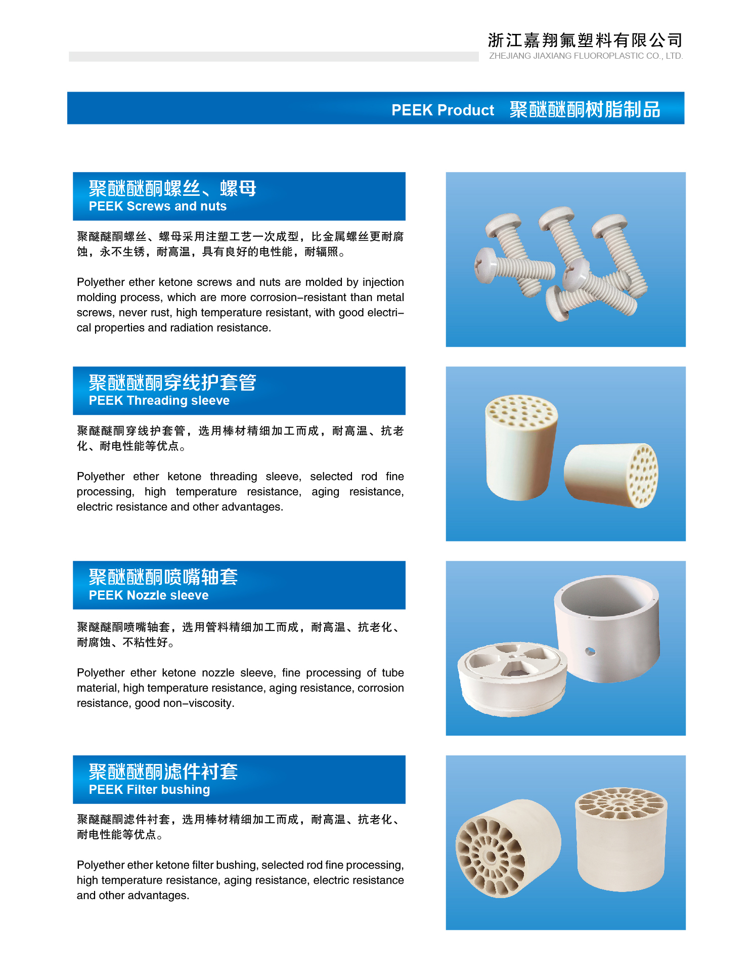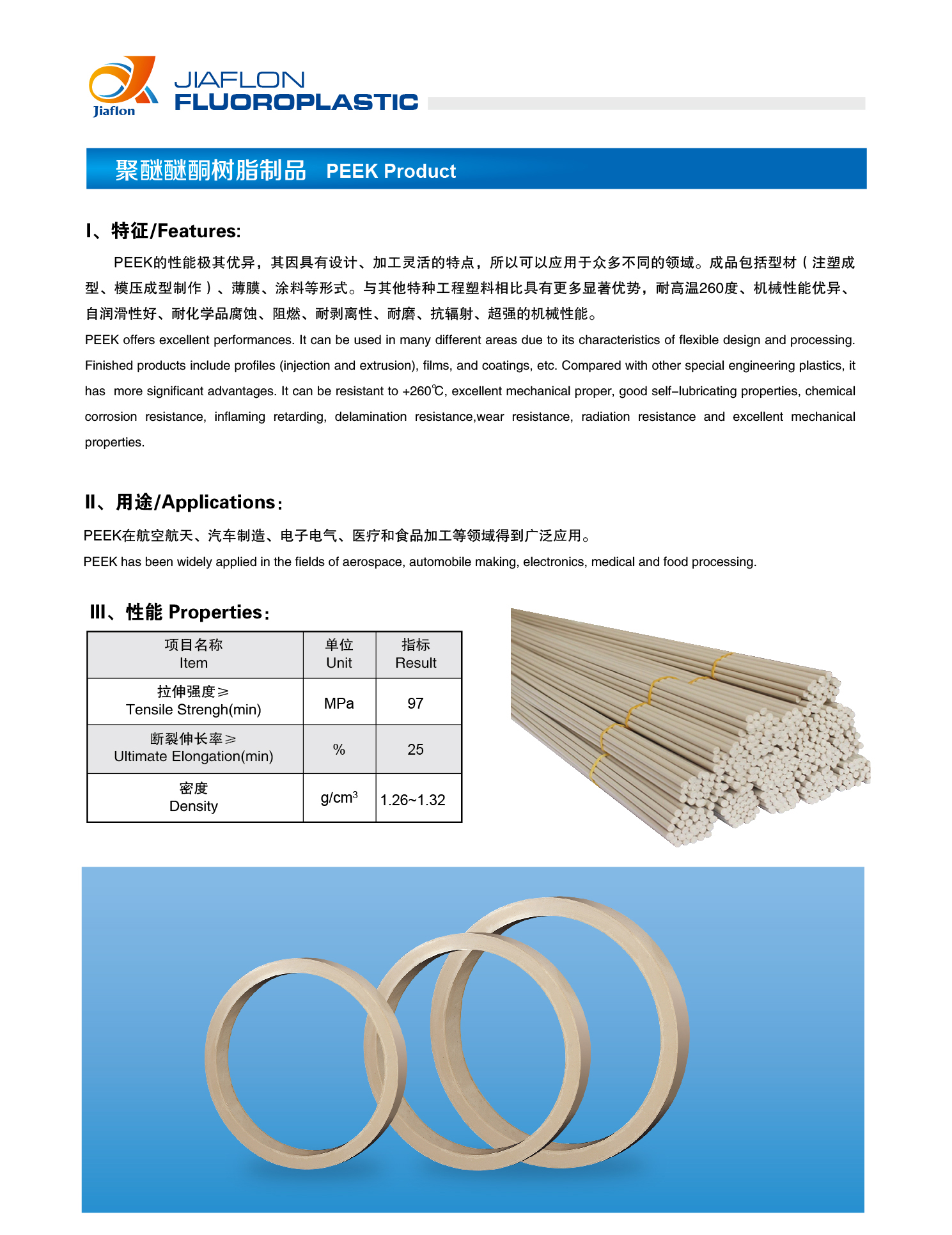 聚醚醚酮(PEEK)是**高性能特种工程塑料,嘉翔氟塑 PEEK 制品以高纯 PEEK 树脂为原料,经注塑、模压、精密加工制成。产品兼具 **+260℃超高温耐受、**机械强度、自润滑耐磨、耐化学腐蚀、耐辐射、阻燃 ** 等核心优势,是航空航天、汽车、半导体、医疗等高端领域的核心结构材料,可替代金属实现轻量化、长寿命升级。