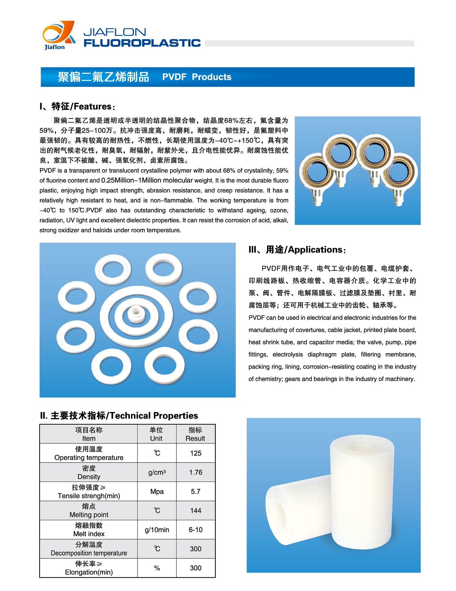 聚偏二氟乙烯(PVDF)是氟塑料中综合力学性能**异的结晶性聚合物,嘉翔氟塑 PVDF 制品以高纯 PVDF 树脂为原料,经模压、挤出、注塑等工艺制成。产品兼具高机械强度、耐化学腐蚀、耐候抗老化、优异介电性能等核心优势,是氟塑料中韧性**的品类,广泛应用于电子电气、化工防腐、机械加工等领域。