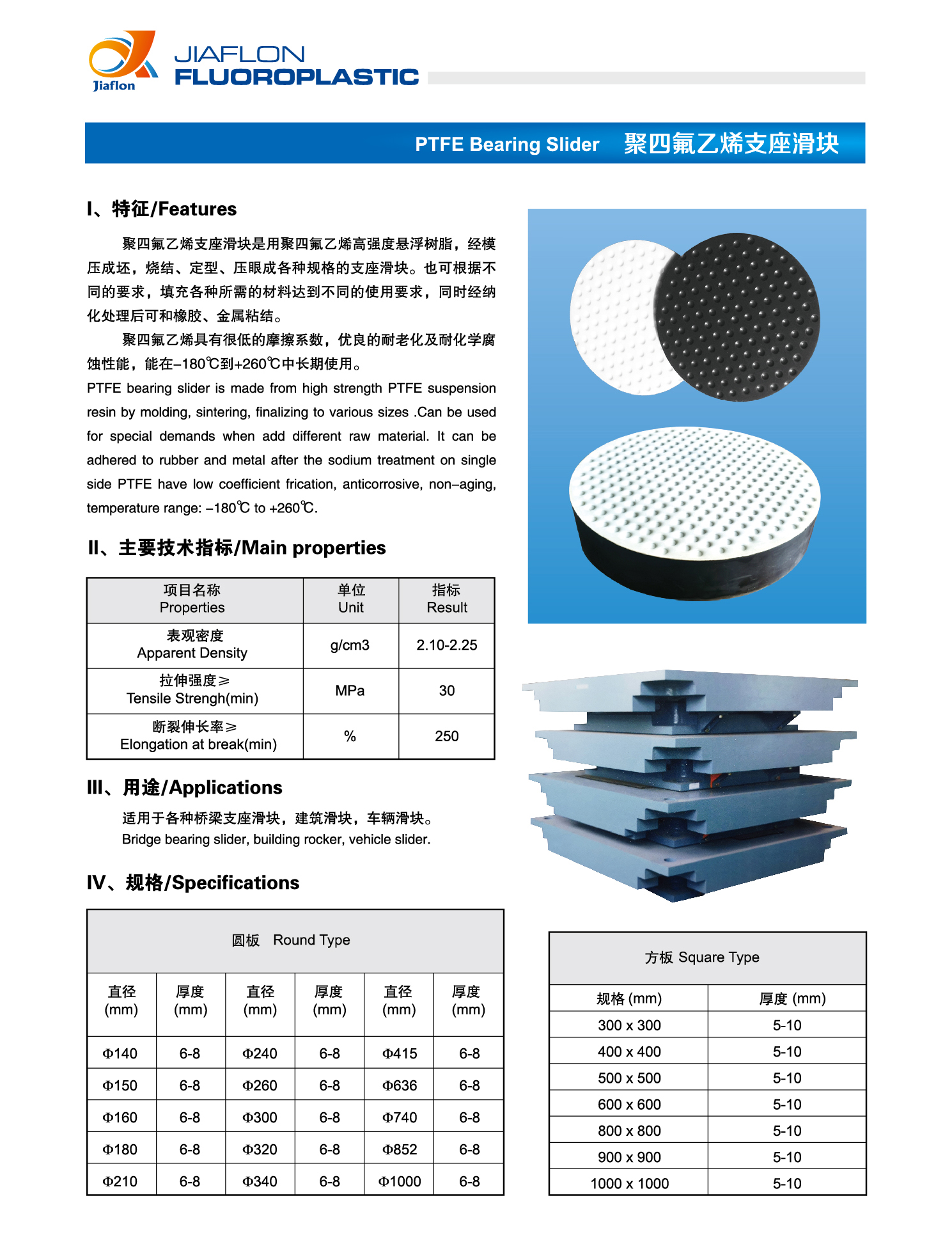 嘉翔氟塑 PTFE 支座滑块,以高纯聚四氟乙烯(PTFE)悬浮树脂为原料,经精密模压、烧结、定型工艺制成。产品融合了 PTFE**摩擦系数、优异的耐化学腐蚀性、耐高低温、耐老化四大核心性能,是桥梁支座、建筑减震、车辆滑块等大型结构工程与机械运动部件的理想滑动解决方案。
