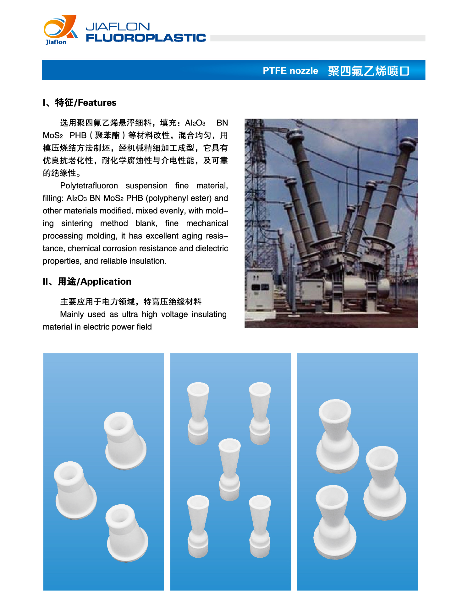 嘉翔氟塑 PTFE 喷口,以高纯聚四氟乙烯(PTFE)悬浮细料为核心原料,添加Al₂O₃、BN、MoS₂、PHB(聚苯酯)等高性能改性材料,经混合均匀、模压烧结成坯,再通过精密机械精加工制成。产品针对特高压、强腐蚀、高洁净的**工况设计,是电力、化工、半导体等领域高端流体喷射与绝缘防护的核心解决方案。