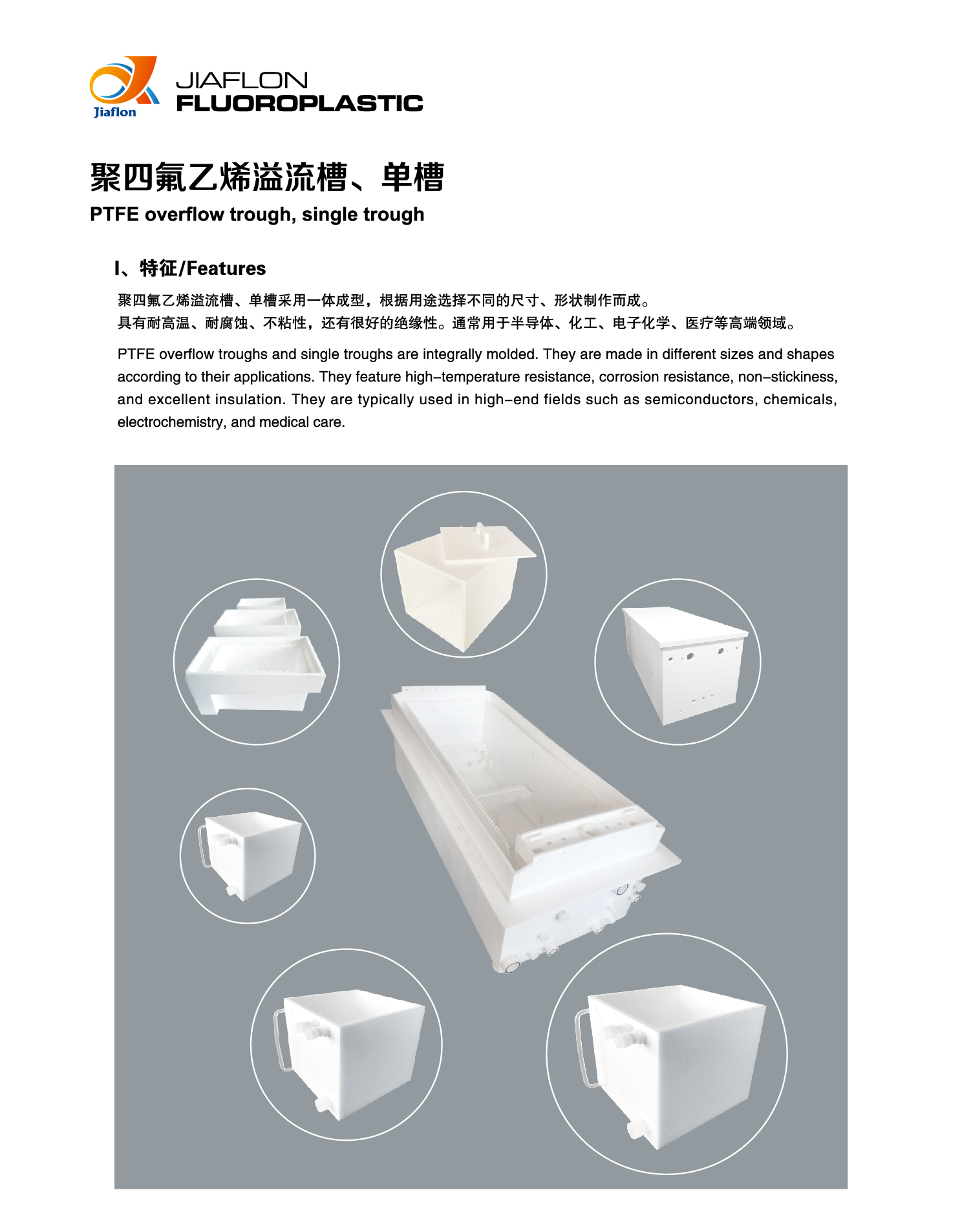 特征:聚四氟乙烯溢流槽、单槽采用一体成型,根据用途选择不同的尺寸、形状制作而成。具有耐高温、耐腐蚀、不粘性,还有很好的绝缘性。通常用于半导体、化工、电子化学、医疗等高端领域。